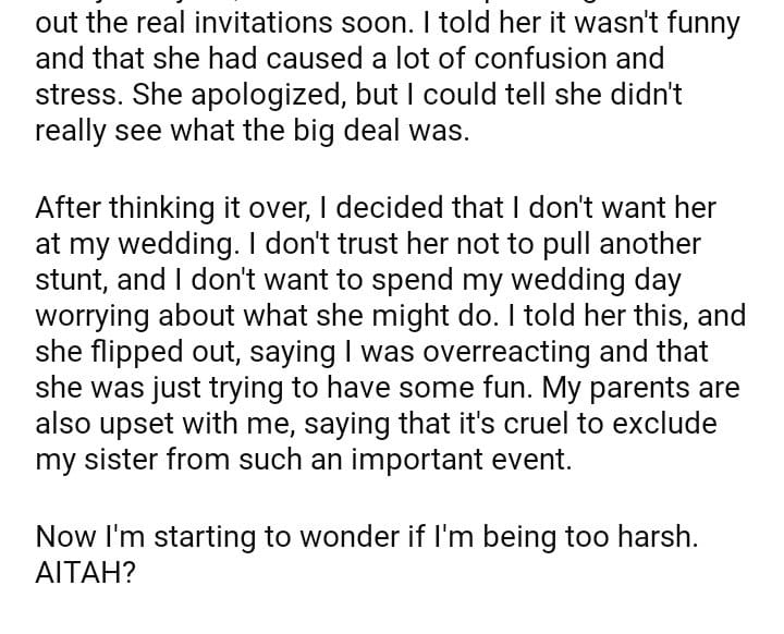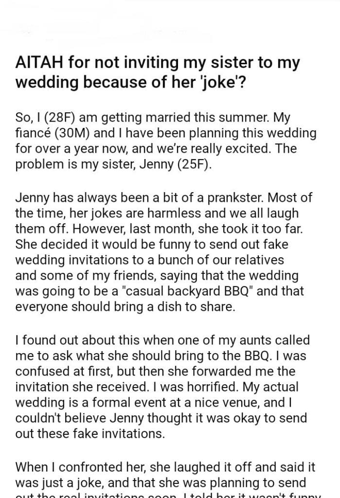 AITAH for not inviting my sister to my wedding because of her ‘joke’?