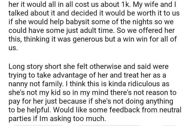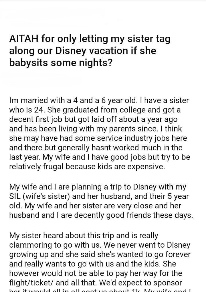 AITAH for only letting my sister tag along our Disney vacation if she babysits some nights?