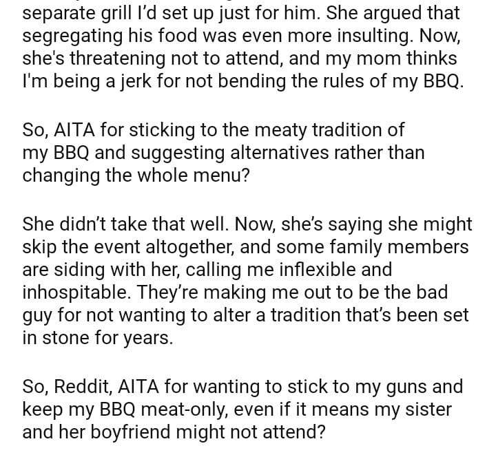 AITAH for refusing to adapt my annual BBQ for my sister’s vegan boyfriend?