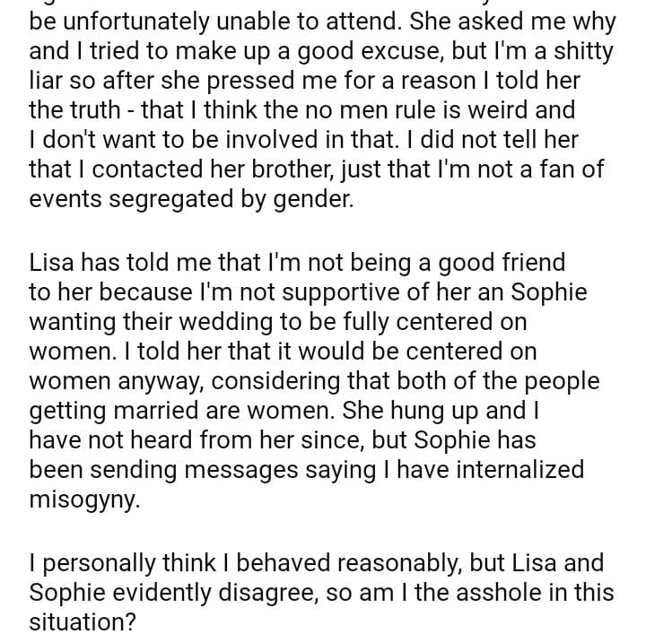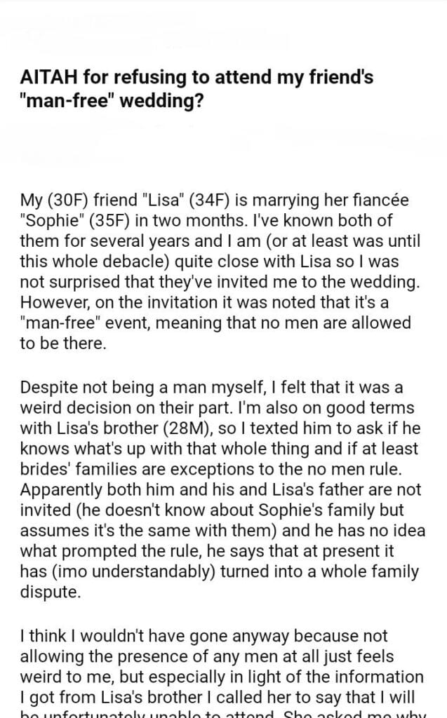 AITAH for refusing to attend my friend’s “man-free” wedding?