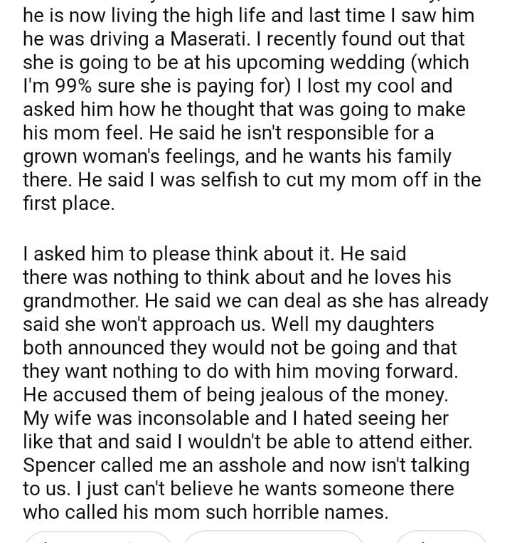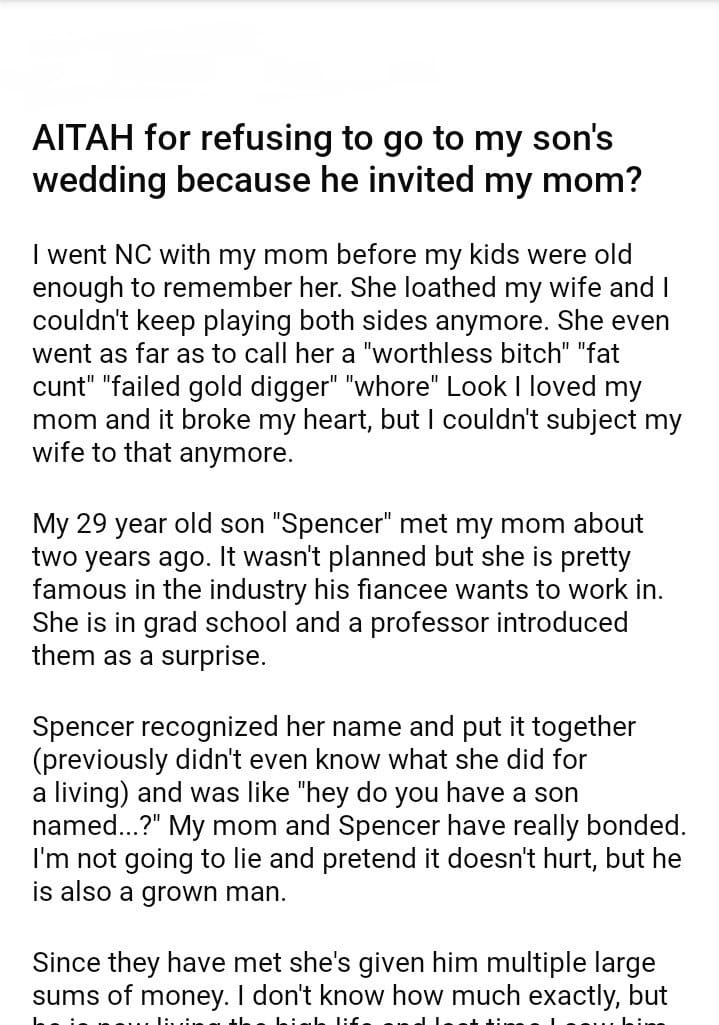 AITAH for refusing to go to my son’s wedding because he invited my mom?