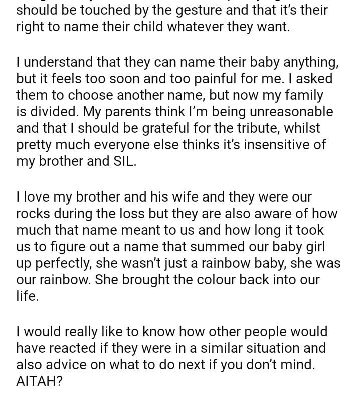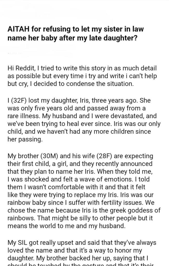 AITAH for refusing to let my sister in law name her baby after my daughter?