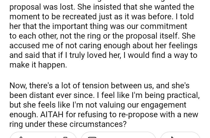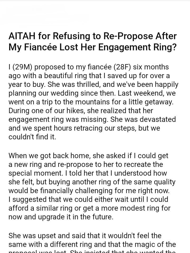 AITAH for Refusing to Re-Propose After My Fiancée Lost Her Engagement Ring?
