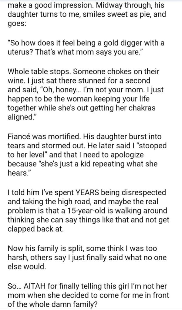 AITAH for what I told my fiancé’s daughter