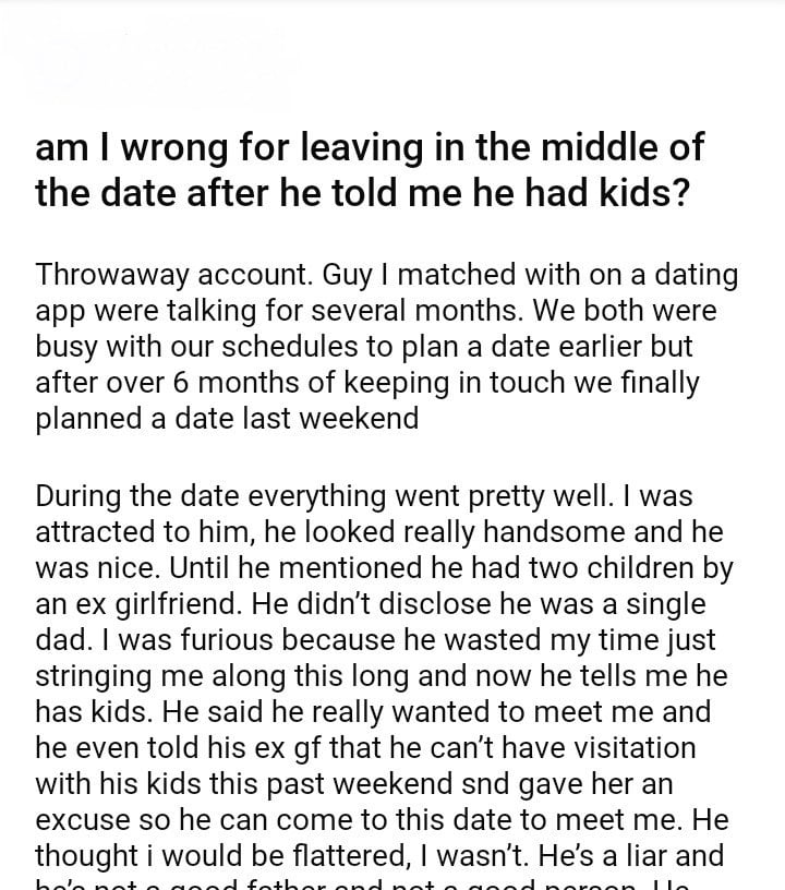 am I wrong for leaving in the middle of the date after he told me he had kids?