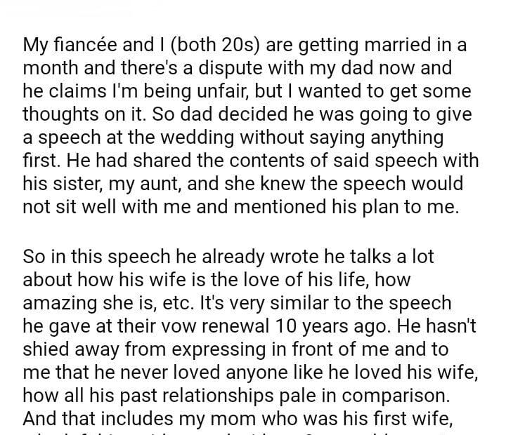 AITA for telling my dad he’s not allowed to give his speech at my wedding?June 27, 2024June 27, 2024AITA