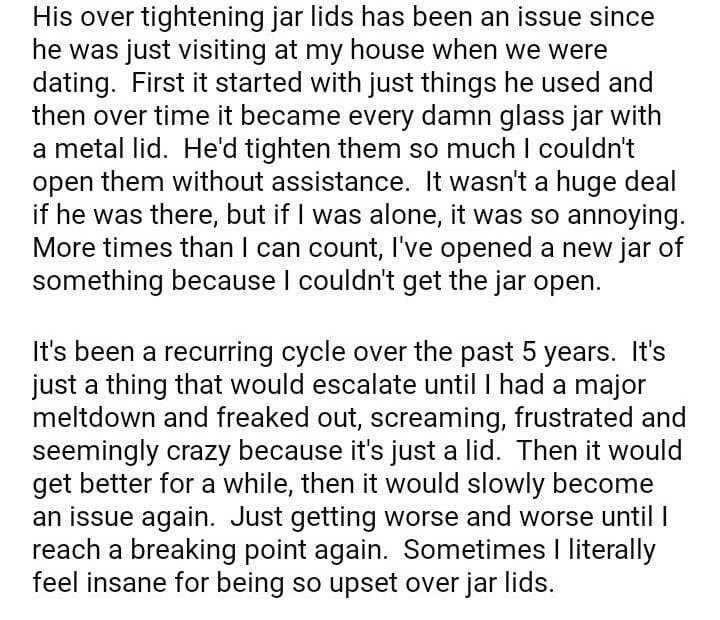 AITAH for filing for divorce because my husband over tightens all the jar lids?June 24, 2024June 24, 2024AITA