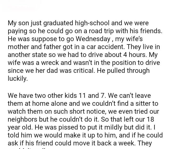 AITA for having my son miss his graduating road trip to watch his sibling.June 14, 2024June 14, 2024AITA
