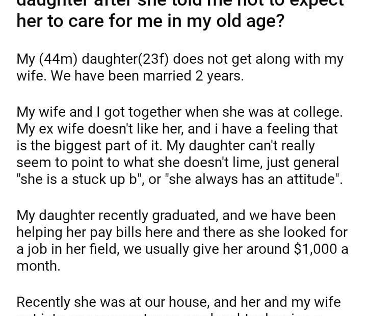 WIBTAH for my daughter after she told me not to expect her to care for me in my old age?May 30, 2024May 30, 2024AITA