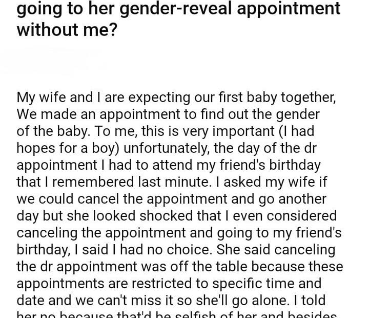 AITA for my wife for going to her gender-reveal appointment without me?
