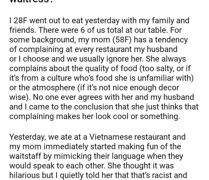 AITA for apologizing for my mom to a waitress?