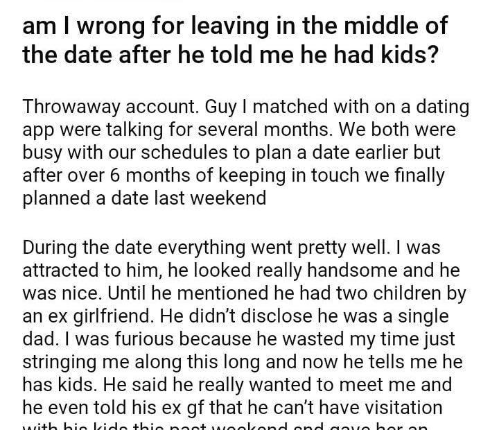 am I wrong for leaving in the middle of the date after he told me he had kids?March 5, 2024March 5, 2024AITA