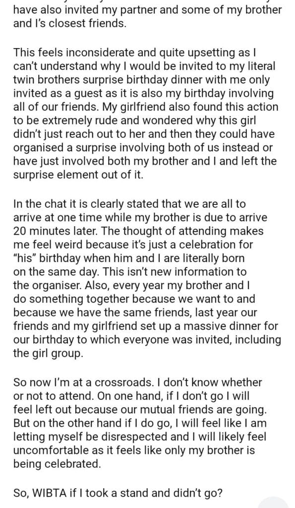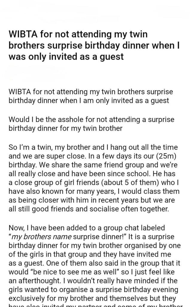 WIBTA for not attending my twin brothers surprise birthday dinner when I was only invited as a guest