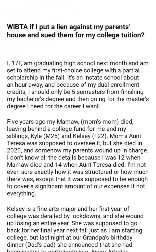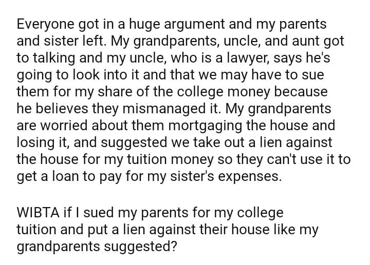 WIBTA if I put my parents’ house and sued them for my college tuition?